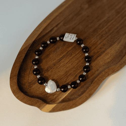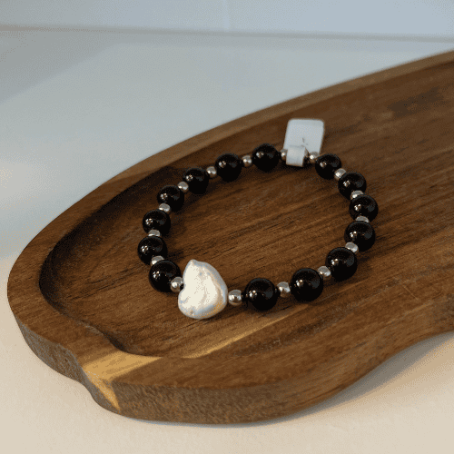 Bransoletka na elastycznej gumce z naturalnego czarnego Turmalinu, srebrnego Hematytu oraz Perły słodkowodnej w kształcie serca. Rozmiar bransoletki 18cm. To wyjątkowe połączenie elegancji i symboliki. Subtelny blask srebrnych akcentów pięknie kontrastuje z głęboką czernią kamieni, a perła w formie serca dodaje całości delikatności i kobiecego charakteru.