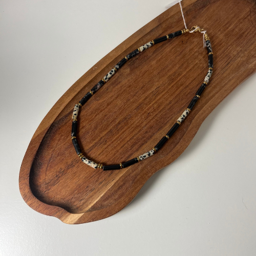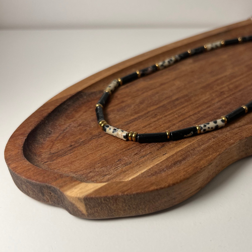 Naszyjnik Choker z Jaspisów cesarskich i dalmatyńskich w kształcie walca z przekładkami ze złotego Hematytu. Wykonany na jubilerskiej lince stalowej. Długość około 39cm.