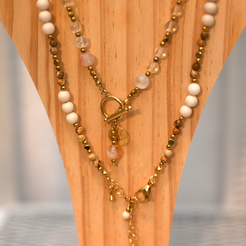 Delikatna bransoletka z beżowych Kamieni Rzecznych, fasetowanego Cytrynu i złotego Hematytu. Połączenie kamieni wspierających wewnętrzną równowagę, klarowność myśli, przyciąganie pozytywnych możliwości oraz wzmocnienie odwagi i wytrzymałości. Idealna dla osób ceniących spokój, energię i naturalną harmonię.
