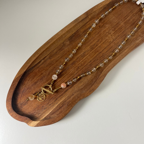 Naszyjnik z Cytrynu w wersji matowej i błyszczącej oraz złotego Hematytu, uzupełniony okrągłą zawieszką inspirowaną tropikalną wyspą. Biżuteria przywołująca wakacyjny klimat i dobrą energię.