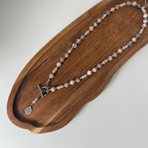 Pastelowy naszyjnik w odcieniach różu i szarości wykonany z Jadeitów i Jaspisów oraz srebrnego Hematytu. Zawieszka koniczynka ażurowa ze srebra próby 925, na szczęście. Zapięcie typu toggle ze stali szlachetnej. Wykonany na jubilerskiej lince stalowej. Średnica kamieni 4mm, 6mm. Długość około 45cm + zawieszka.