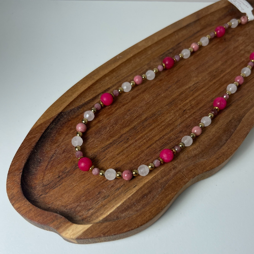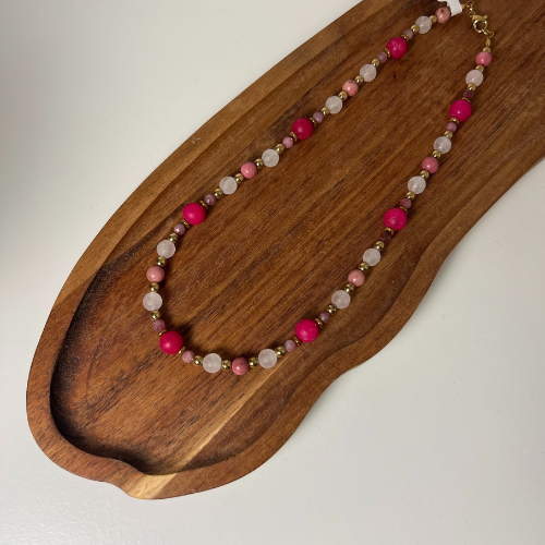 Naszyjnik w różnych odcieniach różu z Turmalinu, Jadeitu, Kwarcu, Rodonitu oraz złotego Hematytu. Wykonany na stalowej lince jubilerskiej, długość około 42cm. Średnica kamieni 4mm, 6mm, 8mm.