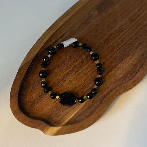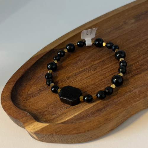 Bransoletka z czarnego Turmalinu oraz złotego Hematytu. Wykonana na elastycznej gumce sylikonowej, rozmiar 18cm. Średnica kamieni 4mm, 6mm, 8mm.