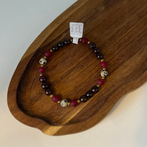 Bransoletka w głębokich bordowych barwach wykonana z naturalnego Granatu, jadeitu, Jaspisu dalmatyńskiego oraz dodatku złotego Hematytu, bransoletka wykonana na elastycznej gumce sylikonowej, rozmiar 18cm. kamienie średnicy 6mm.