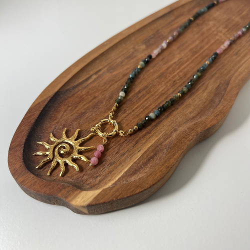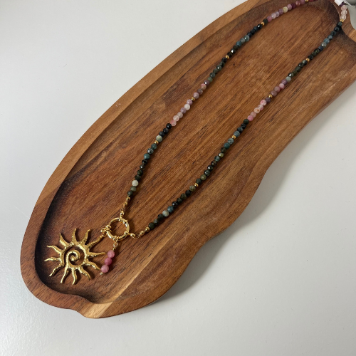 Wyjątkowy naszyjnik z drobnych fasetowanych wielokolorowych Turmalinów oraz złotego Hematytu. Zapięcie i zawieszka wykonane ze stali szlachetnej pozłacanej. Naszyjnik wykonany na stalowej lince jubilerskiej, długość około 49cm. Fasetowane kamienie oraz mosiężna zawieszka w kształcie słońca przyciągają uwagę oraz dodają charakteru.