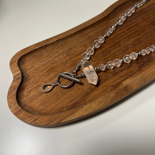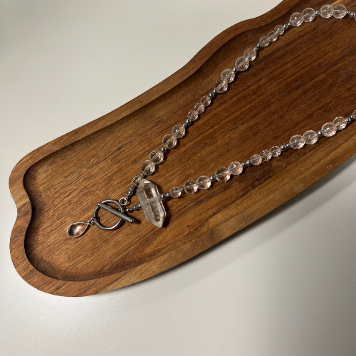 Naszyjnik z kryształu górskiego w trzech formach z dodatkiem Hematytu. Naszyjnik wspierający oczyszczenie, jasność myśli i wewnętrzną siłę.