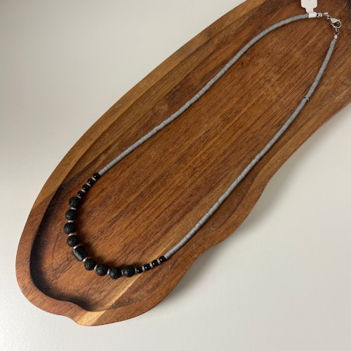 Męski naszyjnik oparty na sile trzech kamieni ochronnych: Hematytu, Lawy i Turmalinu. To połączenie symbolizuje stabilność, odwagę i wewnętrzny spokój. Kamienie pomagają oczyścić energię, zneutralizować stres oraz wzmocnić odporność psychiczną, wspierając pewność siebie i równowagę w codziennych wyzwaniach.